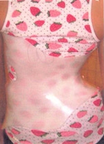 (患者様からビュテフルボディスーツと呼ばれています)肋骨変形をも左右対称にさせる構造になっています。定期検診と定期的装具のチェック、パッド、ベルトを成長改善に合わせて変化の対応をさせることが装具治療の肝心です。