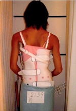 注)装具にパッドがなく支柱が前後各1本のため矯正力がなく身体が変形する悪い装具例。