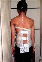 (2)定期検診時にボディラインと装具の検査をしパッドの厚さ位置を理想的な部位に装着。 |